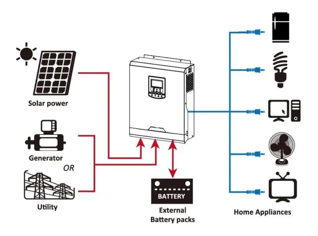 Además, permite ajustar la corriente de carga y configurar la prioridad de uso entre energía solar, baterías o red eléctrica, brindando flexibilidad según las necesidades del usuario.